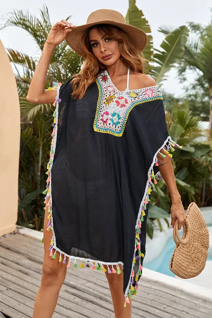 Maar wat deze jurk echt onderscheidt, is de speelse franje die bij elke beweging zachtjes danst, waardoor een vleugje speelsheid en flair wordt toegevoegd aan je zomerse look. Laat je betoveren door de Ela gehaakte strandjurk en omarm het seizoen met stijl en gratie!